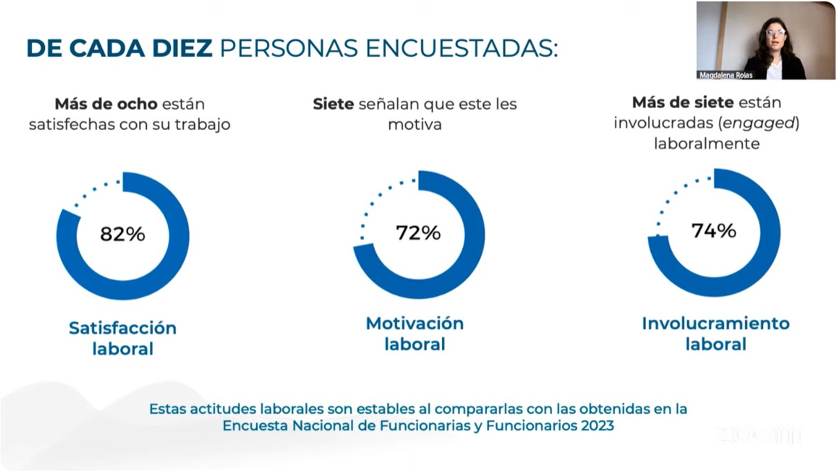 En materia de actitudes laborales, la encuesta mostró que ocho de cada diez participantes dijo estar satisfecho con su trabajo, muy cerca de los promedios internacionales. Un 67% manifestó sentirse comprometido con su organización y un 81% expresó estar comprometido con el servicio público y la ciudadanía. Tres de cada cinco señaló confiar en otros miembros de su servicio y solo un 42% dijo confiar en las/los directivos de su organización, persistiendo el tema de la confianza interpersonal como uno de los desafíos a abordar.